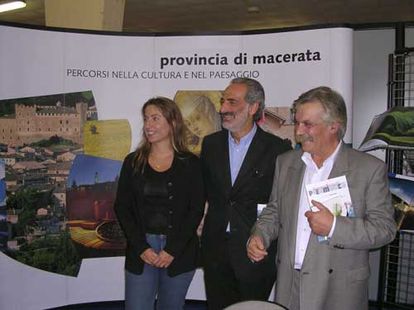 Il presidente Giulio Silenzi nello stand della Provincia insieme alla scrittrice civitanovese Giuseppina Vallesi e allideatore ed organizzatore di Cartacanta, Enrico Lattanzi.
