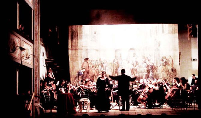 Dopo attimi di sconcerto, lattacco del maestro e subito si comprende che si assiste ad un evento. Lorchestra si ascolta, riescono a trovarsi, come racconteranno i musicisti, la perfetta acustica del Mercantini li esalta e il suono diviene leggiadro. Il canto non si disperde, le voci arrivano dirette agli spettatori, li travolgono di emozioni, a testimoniarlo i lunghi applausi e la straordinaria ovazione finale. Mancano le scene ma lantico fondale del Mercantini, il vibrato degli archi, fanno da cornice perfetta alla rappresentazione. Bastano due tavoli e quattro sedie per immergersi nella Parigi di fine ottocento.