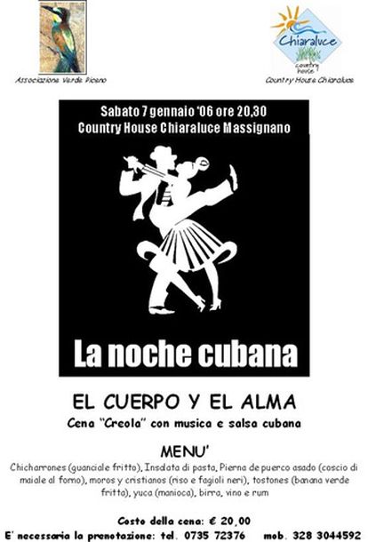 Per sabato prossimo, 7 gennaio, alle ore 21 presso la Country House Chiaraluce di Massignano ci sarà una serata intitolata <El cuerpo y el alma>, cena creola con musica e salsa cubana, il menù prevede cicharrones (guancale soffritto), ensalada de coditos (insalata di pasta), pierna de puerco asado (coscio di maiale al forno), moros y cristianos (riso e fagioli neri), tostones (banane fritte), yuca con mojo (manioca), birra, vino e rum. Per prenotazioni telefonare allo 0735 72376 oppure al 328 3044592