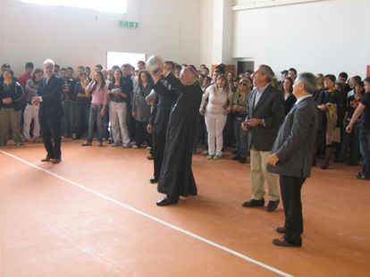San Benedetto del Tronto | Dopo il taglio del nastro, simpatico fuori programma allinterno della nuova palestra dove si sono affrontate in una mini gara di pallavolo una squadra di studenti e una di autorità guidata dal mons. Gestori.