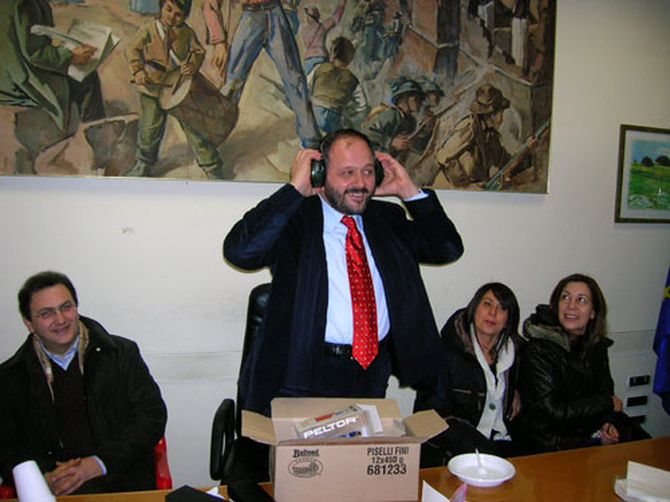 Al sindaco sono andati una penna e… gli attrezzi di lavoro, mentre ai circa trenta lavoratori portachiavi con l’immagine del “Monumento di parole” realizzato da Ugo Nespolo per la città di San Benedetto (“Lavorare, lavorare, lavorare, preferisco il rumore del mare”).