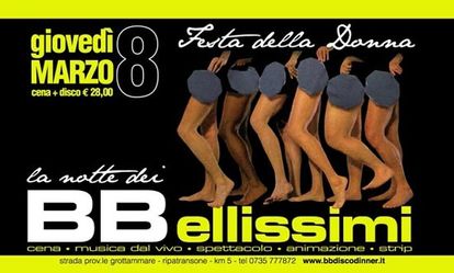 Giovedì 8 marzo, Festa della Donna con la tradizione consolidata al BB Discodinner. Quest'anno nel corso della cena si susseguiranno diversi spettacoli di strip maschile. Ingresso cena e disco € 28,00. Le prenotazioni sono d'obbligo in serate di successo come quella di questo giovedì. Animazione, strip, musica dal vivo e poi tanta musica da discoteca per la gioia di tutte le donne.
