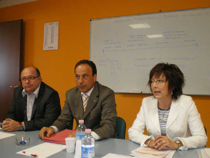 ripresi da sinistra il Presidente della Commerfidi soc.coop. Rag. Alberto De Angelis, il Direttore della Commerfidi soc.coop. Dott. Rino Di Marco ed il Condirettore Unicredit per la Regione Marche Dott.ssa Patrizia Paolucci.