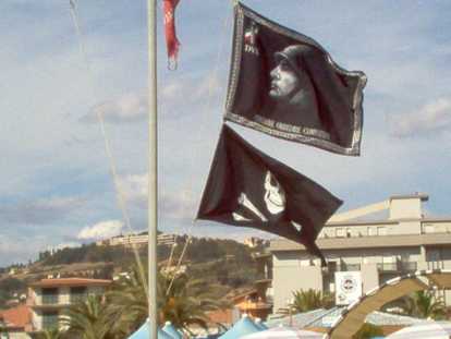 Pare che il Duce sia tornato a visitarci. Almeno così annunciano le foto finite sulla prima pagina del sito de La Repubblica, scattate probabilmente di mattina in uno stabilimento balneare di Tortoreto Lido (Teramo). Nelle foto compaiono due bandiere nere, una delle quali, sventolando, inequivocabilmente inneggiante al cavalier Benito Mussolini. Cosa, quest'ultima, espressamente vietata dalla Costituzione. Ma tant'è! Bandiere come questa (foto) si vendono nelle bancherelle di ogni dove: al mare, in città e in montagna. Un conto, però, è acquistarla per collezionarla privatamente, un conto è esporla e farla sventolare in pubblica piazza.