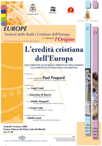 Un incontro a cui parteciperà S.E. mons. card. Paul Paupard, presidente emerito del Pontificio Consiglio della Cultura. Interverranno: mons. Luigi Conti, arcivescovo della diocesi di Fermo, Saturnino Di Ruscio sindaco della città di Fermo, il prof. Adolfo Morganti console, Direttore Nazionale di "Identità Europea", il dr. Cesare Catà,