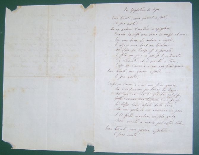 "Il prezioso documento è una poesia patriottica risorgimentale che narra la sfortunata spedizione di Carlo Pisacane nel Regno delle due Sicilie e che fino a qualche hanno fa ha caratterizzato le pagine di tutte le antologie scolastiche - spiega il Prof. Antonio Giannetti - inoltre "La Spigolatrice" non è l'unica poesia nota di questo letterato: ricordiamo, infatti, che Garibaldi, suo grande amico, gli commissionò anche la poesia "Si scopron le tombe, si levano i morti", meglio nota come "L'inno di Garibaldi", musicata poi da Alessio Olivieri e che "l'eroe dei Due Mondi" utilizzò come inno marziale, nel 1858, anni cruciali del processo che portò all'Unità d'Italia".