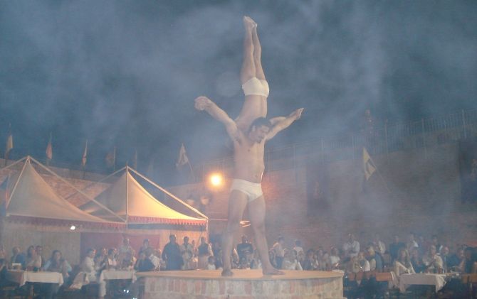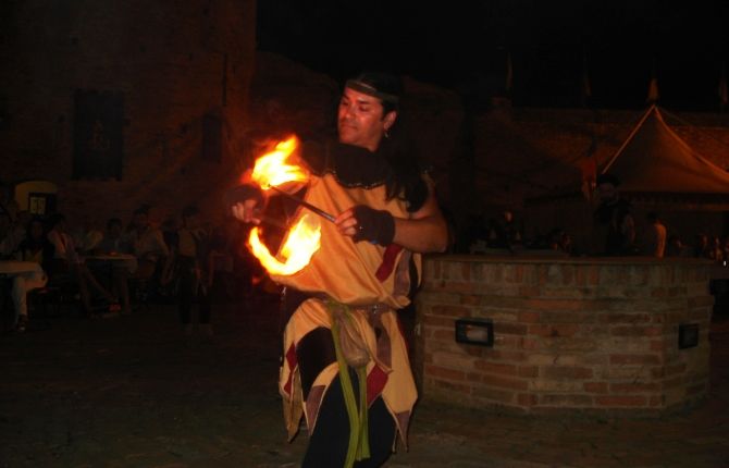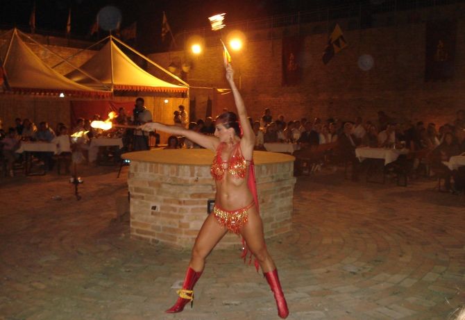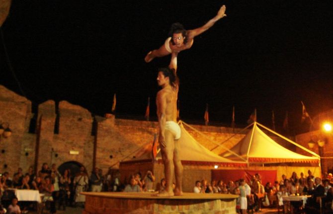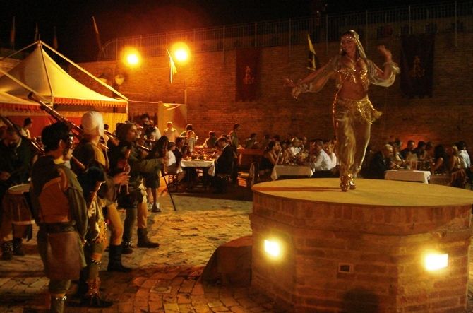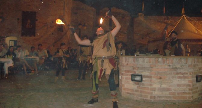 Il lauto banchetto, se così si può dire dato che mangiare con un cucchiaio di legno la salsiccia ha creato difficoltà a molti e i più vi hanno rinunciato, di ben quattro portate, è stato accompagnato da vari spettacoli di intrattenimento tra cui una provocante danzatrice del ventre, un duo cileno, i Tobarich, che ha offerto uno spettacolo di contorsionismo da togliere il fiato e la compagnia di artisti di strada in costume di Davide Rossi che ha proposto spettacoli di coraggio tra fuoco, armi e serpenti, il tutto mentre Forastéria e Rinaldo festeggiavano dall'alto della torre il loro matrimonio.