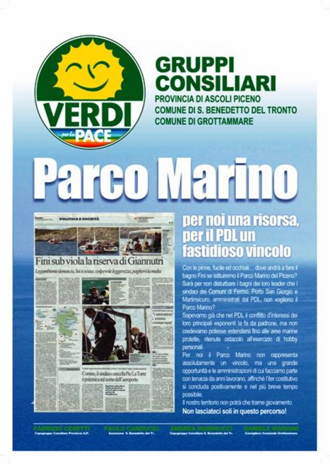 Ha presentato con tali premesse l'assessore all'ambiente del comune di San Benedetto del Tronto Paolo Canducci l'iniziativa promossa dai Verdi a sostegno dell'istituzione del Parco Marino, che consiste nell'affissione nelle città interessate di centinaia di manifesti a sostegno del noto progetto ambientale, nonché da una approfondita attività istituzionale. Presenti alla conferenza stampa anche il consigliere comunale nonché capogruppo dei Verdi presso il comune di Grottammare Daniele Mariani e Andrea Marinucci, Capogruppo dei Verdi presso il comune di San Benedetto del Tronto.
