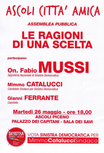 Questi saranno i principali punti che saranno illustrati dall'Onorevole FABIO MUSSI della segreteria nazionale di Sinistra Democratica, Gianni Ferrante capolista e dal candidato Sindaco per Sinistra Democratica Mimmo Catalucci.