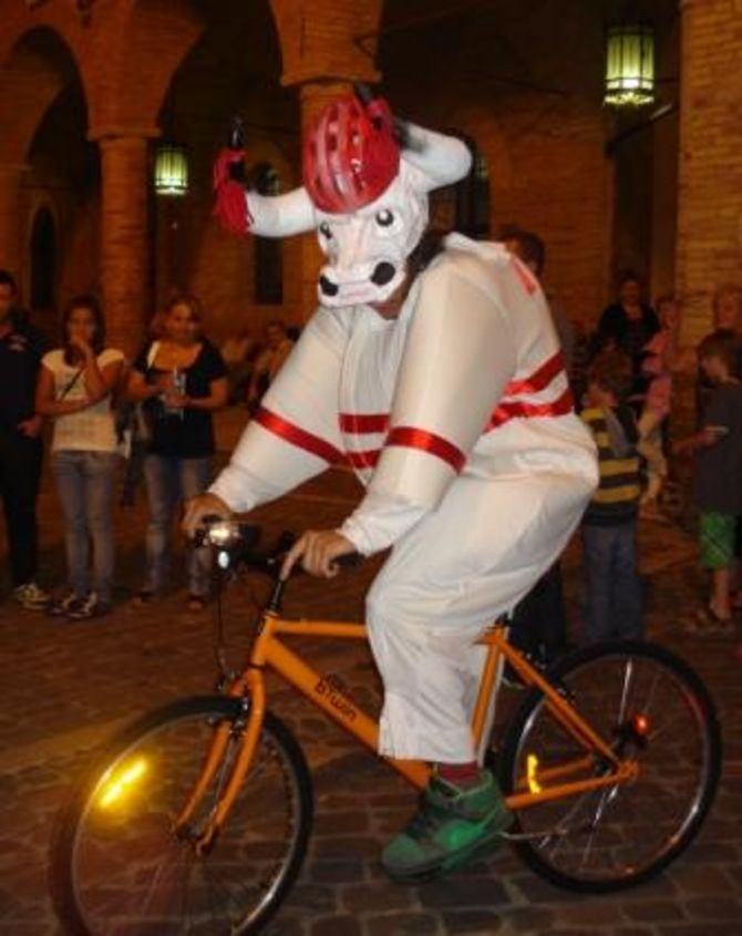 E visto che siamo ad Offida, quale poteva mai essere il simbolo del mondiale? Inutile dirlo: il Bove Finto...anche lui a bordo dell'immancabile bicicletta.