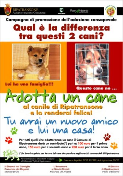 Per quelli che adotteranno un cane, il Comune di Ripatransone darà un contributo pari a: 100 euro per il primo anno, 150 per il secondo anno e 200 euro per il terzo anno, in buoni acquisti per la cura dell'animale, da spendere negli esercizi commerciali di Ripatransone.