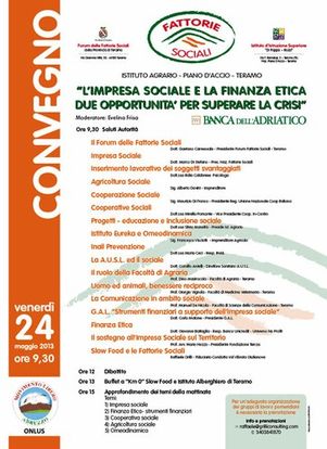 Se ne parlerà venerdì 24 maggio dalle ore 9.30, al Forum delle Fattorie Sociali della Provincia di Teramo, organizzato dal Forum all'Istituto Agrario di Piano d'Accio di Teramo, con la collaborazione dell'Istituto d'Istruzione Superiore "Di Poppa-Rozzi" di Teramo, del Movimento Libero Abruzzo e con la sponsorizzazione della Banca dell'Adriatico, con il patrocinio della Provincia di Teramo.