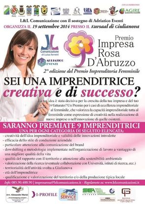 La L&L Comunicazioni organizza il Premio Impresa Rosa d'Abruzzo con il patrocinio della Regione Abruzzo, delle Province di Teramo, de L'Aquila, di Pescara e di Chieti, del Comune di Giulianova, Polo Agire, Comitato Pari Opportunità della Provincia di Teramo, Confindustria Teramo, Confartigianato Abruzzo - Gruppo Donne Impresa, Università degli Studi di Teramo ed Università degli Studi "G. d'Annunzio" - Chieti-Pescara,Informazioni Segreteria Premio Impresa Rosa D'Abruzzo: c/o L & L Comunicazione, via Bindi, 2, 64021 Giulianova (TE) E-mail: impresarosa@lelcomunicazione.it