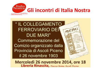 Ancora una volta la Sezione di Italia Nostra organizza un Incontro per commemorare il Comizio organizzato dalla Provincia di Ascoli Piceno il 26 novembre 1930 quando sembrava che fosse ormai imminente l'inizio dei lavori per la realizzazione del Collegamento Ferroviario dei Due Mari. Per le solite ed antiche difficoltà di ordine burocratico non se ne fece nulla. Così un'opera che avrebbe determinato la rivitalizzazione di un territorio che risulta sempre più marginale rimase impantanata nella palude delle acque stagnanti. Eppure l'opera appare ancora necessaria ed utile e sarebbe una infrastruttura fondamentale non solo per il territorio piceno , bensì per tutta la Regione Marche e per il Medio-Adriatico.