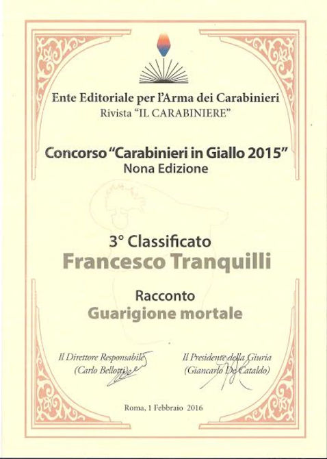Il giallista sambenedettese Francesco Tranquilli aveva tentato un'altra volta di arrivare al podio (nel 2010) ma si era fermato al quarto posto, con un altro racconto che portava in scena il Maresciallo Principe e la sua squadra, indimenticati protagonisti del suo romanzo d'esordio, Blackout, del 2009.